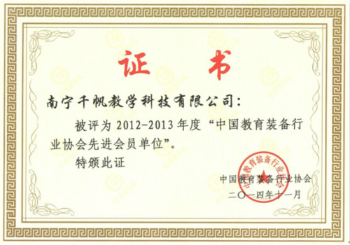 熱烈慶祝南寧千帆獲得了由中國教育裝備行業(yè)協(xié)會(huì)辦頒發(fā)的2012-2013年度“中國教育裝備行業(yè)協(xié)會(huì)先進(jìn)會(huì)員單位”證書,成為廣西本年度唯一一家獲此榮譽(yù)的企業(yè)。榮譽(yù)激勵(lì)著千帆人再接再厲,爭取為教育事業(yè)作出更多貢獻(xiàn)。