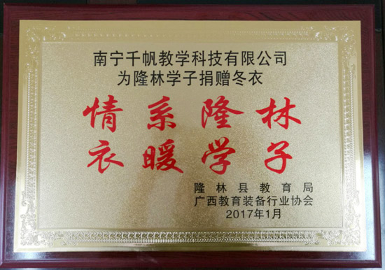 2017年1月9日,南寧千帆公司跟隨廣西教育裝備行業(yè)協(xié)會組織的“情系山區(qū),衣暖人心”活動來到廣西隆林縣德峨中學,為這里的孩子們送上冬衣、冬鞋。