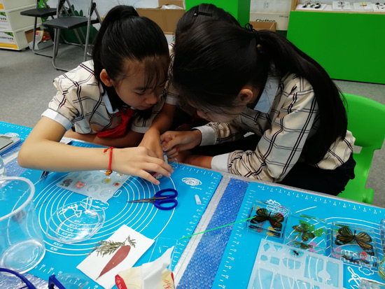 展會(huì)現(xiàn)場(chǎng)-工作人員給來(lái)訪人員介紹DIY學(xué)生實(shí)驗(yàn)制作解決方案產(chǎn)品及學(xué)生們展示DIY制作標(biāo)本